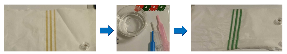 お知らせサインホットメルト接着剤は、水に濡れると色が変わる特性を持つホットメルト接着剤です。この接着剤は、赤ちゃん用や大人用紙おむつに使われ、実際に手で触ったり開いたりしなくても、おむつが湿って交換が必要かどうかを視覚的に知らせるサインとして使用されています。