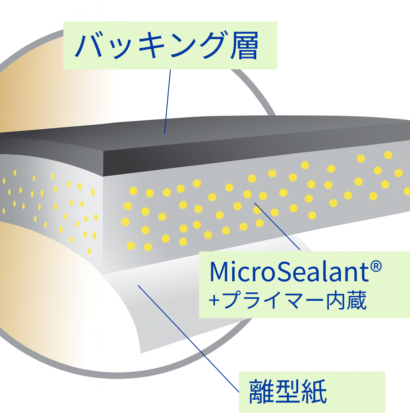 エターナボンドは、H.B.Fullerの特許技術「MicroSealant®(マイクロシーラント)」を採用した最先端の防水テープです。テープの粘着層にあらかじめプライマー成分を含有させる独自技術によって、圧着だけで直ちに防水・気密性を維持します。