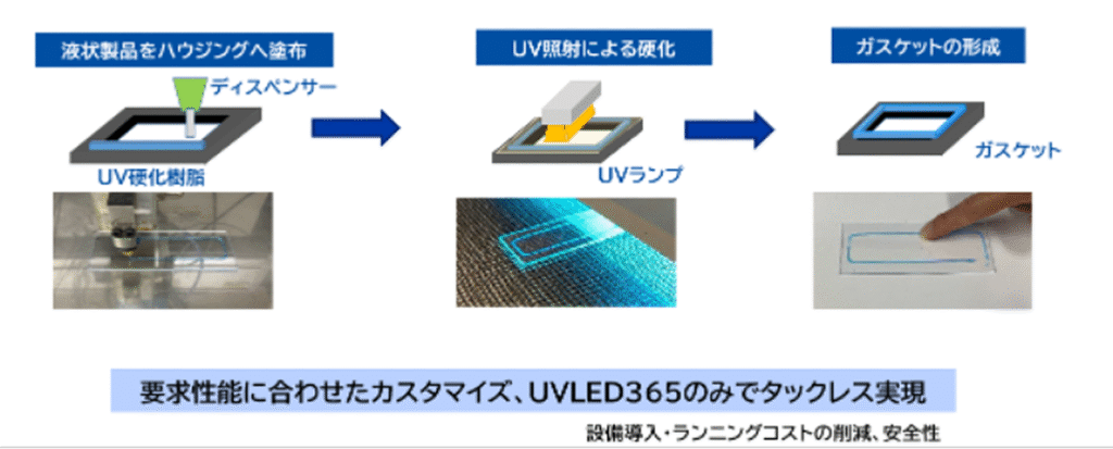CIPGは部品に液状ガスケットを塗布後、UVで硬化させる方式で、ガスケットが部品に固定されつつもリワークが可能な点が特長です。