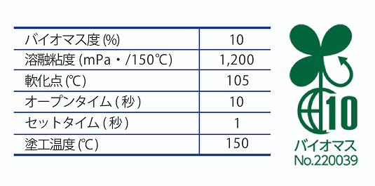 環境に配慮したバイオマス原料配合であり、石油由来の接着剤と変わらない使い勝手と接着性能の両立を実現。石油資源節約とCO2排出量削減に貢献します。