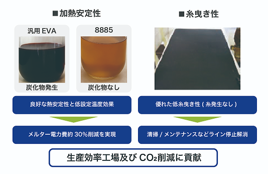 加熱安定性に優れ、糸引きや臭気の発生が少なく、作業環境を改善します。